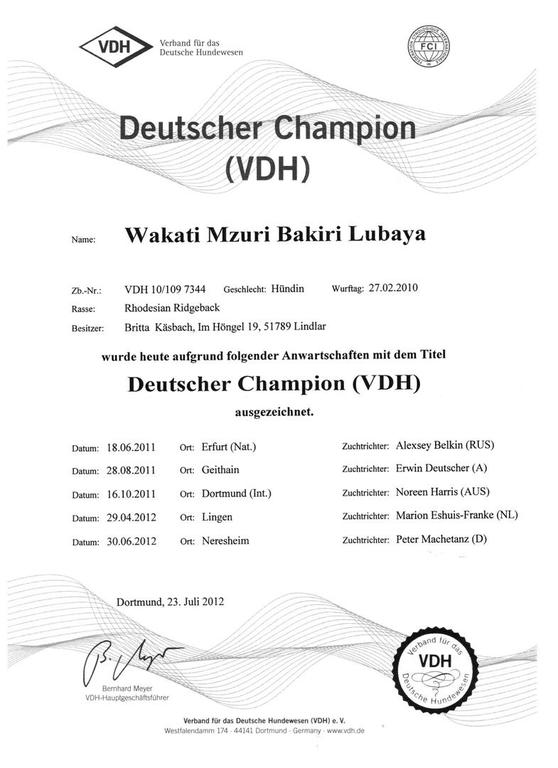 Lubaya hat sich auf Ausstellungen immer sehr erfolgreich präsentiert, sie wurde innerhalb kürzester Zeit Jugendchampion VDH und Club sowie Deutscher Champion. Bislang hatte sie 2 Würfe, die sie zuverlässig und sicher aufgezogen hat. Ihre Nachzucht ist sehr vielversprechend und präsentiert sich ebenfalls sehr erfolgreich im Ring.