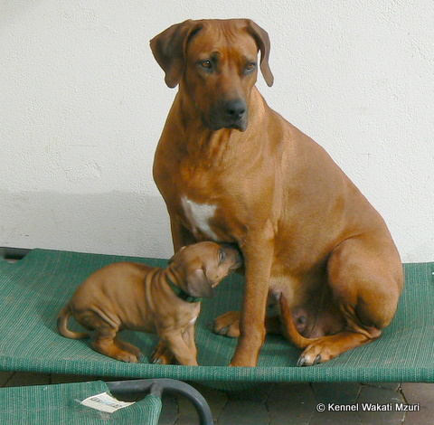 Chinue hat in 3 Würfen 35 Welpen groß gezogen. Sie war immer eine sehr korrekte Mutter und hat die Welpen sicher und komplikationslos umsorgt.