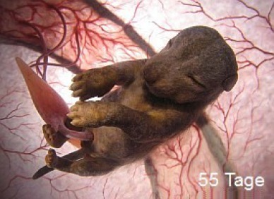 Die Knochen verstärken sich, die Welpen können nun leicht unter der Bauchdecke ertastet werden. Die Haare am Bauch der Hündin fallen ggf. aus. Die Größe der Frucht