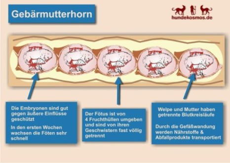 Der Uterusumfang nimmt 2/3 der Bauchhöhle ein. Aus diesem Grund bekommt die Hündin mehrere kleine Mahlzeiten.
