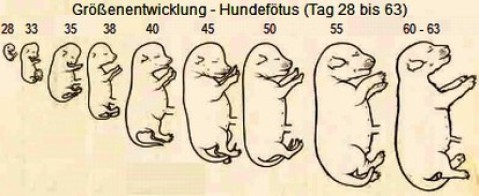 Mit dieser Tabelle möchte ich die Abläufe im Innern der Mutterhündin ein wenig beleuchten. Eine Trächtigkeit dauert etwa 63 Tage, also rund 9 Wochen. Erst nach 3 1/2 - 4 Wochen kann man überhaupt feststellen, ob die Hündin tragend ist. Bis zur Geburt geht es dann mit den verbleibenden 4 Wochen rasend schnell!